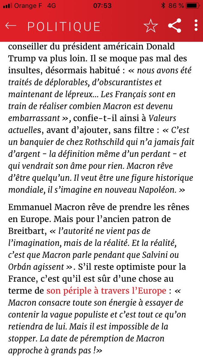 Emmanuel Macron rêve de prendre les rênes en Europe. Mais pour l’ancien patron de Breitbart, « l’autorité ne vient pas de l’imagination, mais de la réalité. Et la réalité, c’est que Macron parle pendant que Salvini ou Orbán agissent ». S’il reste optimiste pour la France, c’est qu’il est sûr d’une chose au terme de son périple à travers l’Europe : « Macron consacre toute son énergie à essayer de contenir la vague populiste et c’est tout ce qu’on retiendra de lui. Mais il est impossible de la stopper. La date de péremption de Macron approche à grands pas !»