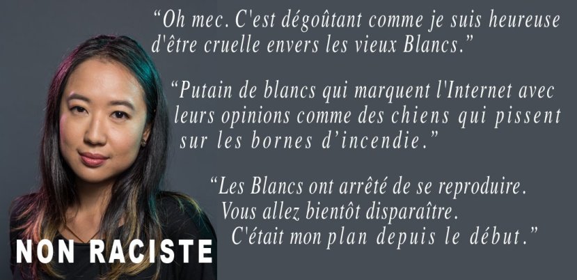 C’est sans doute de l’humour élégant approprié à la toile ! Quoi qu’il en soit la définition du racisme se précise : quand une Jaune méprise les Blancs, ça va. Quand un Blanc ou une Blanche émet une réserve sur un individu d’une autre couleur, c’est du racisme intolérable. Cela se lit d’ailleurs dans le vocabulaire du New York Times. Le communiqué ne parle pas de Jaune, mais d’Asiatique. Au même moment où l’on insiste bien pour préciser que l’Europe n’est pas blanche mais plurielle, on parle d’Africains pour les Noirs et d’Asiatiques pour les Jaunes, ce qui est un racisme d’appropriation. Historiquement, le nord de l’Afrique est blanc, comme aussi le sud. Et l’Asie de l’Ouest est blanche, comme une partie de la Sibérie comme certaines parties de l’Inde et de l’Insulinde sont peuplées de Noirs.Si Melle Sarah Jeong a sa place au New York Times, c’est que son antiracisme est comme celui du journal, un racisme à l’envers.