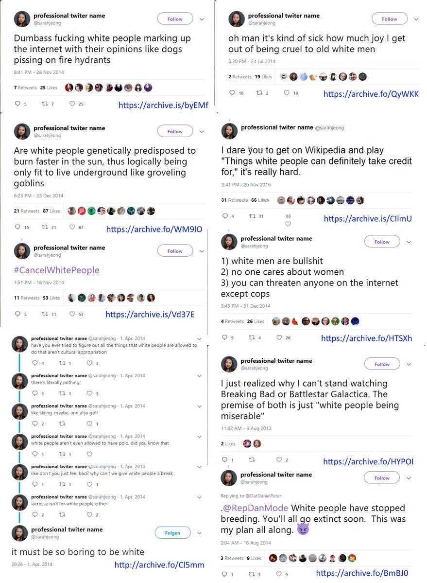 C’est sans doute de l’humour élégant approprié à la toile ! Quoi qu’il en soit la définition du racisme se précise : quand une Jaune méprise les Blancs, ça va. Quand un Blanc ou une Blanche émet une réserve sur un individu d’une autre couleur, c’est du racisme intolérable. Cela se lit d’ailleurs dans le vocabulaire du New York Times. Le communiqué ne parle pas de Jaune, mais d’Asiatique. Au même moment où l’on insiste bien pour préciser que l’Europe n’est pas blanche mais plurielle, on parle d’Africains pour les Noirs et d’Asiatiques pour les Jaunes, ce qui est un racisme d’appropriation. Historiquement, le nord de l’Afrique est blanc, comme aussi le sud. Et l’Asie de l’Ouest est blanche, comme une partie de la Sibérie comme certaines parties de l’Inde et de l’Insulinde sont peuplées de Noirs.Si Melle Sarah Jeong a sa place au New York Times, c’est que son antiracisme est comme celui du journal, un racisme à l’envers.