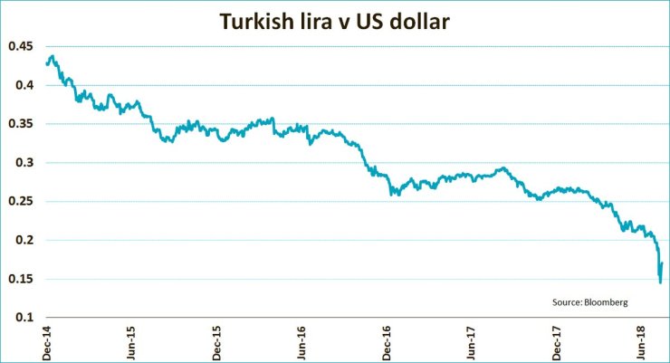 Vendredi dernier, Donald Trump a annoncé de nouvelles sanctions contre la Turquie, notamment le doublement des droits de douane sur l’acier et l’aluminium qu’il avait introduits plus tôt cette année. La monnaie turque était déjà en difficulté, mais ces nouvelles sanctions » sont la goutte qui fait déborder le vase « , selon Edward Park de la société de gestion britannique Brooks Macdonald.