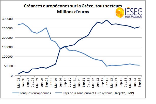 Les contribuables européens ont versé 289 milliards d’euros de prêts à la Grèce lors de trois plans de sauvetage, la part française s’élevant à 40 milliards d’euros. La dette publique grecque s’élève à 180 % de son PIB et le système bancaire est en faillite puisque 98 milliards d’euros, soit 44,9 % des créances bancaires sont douteuses.