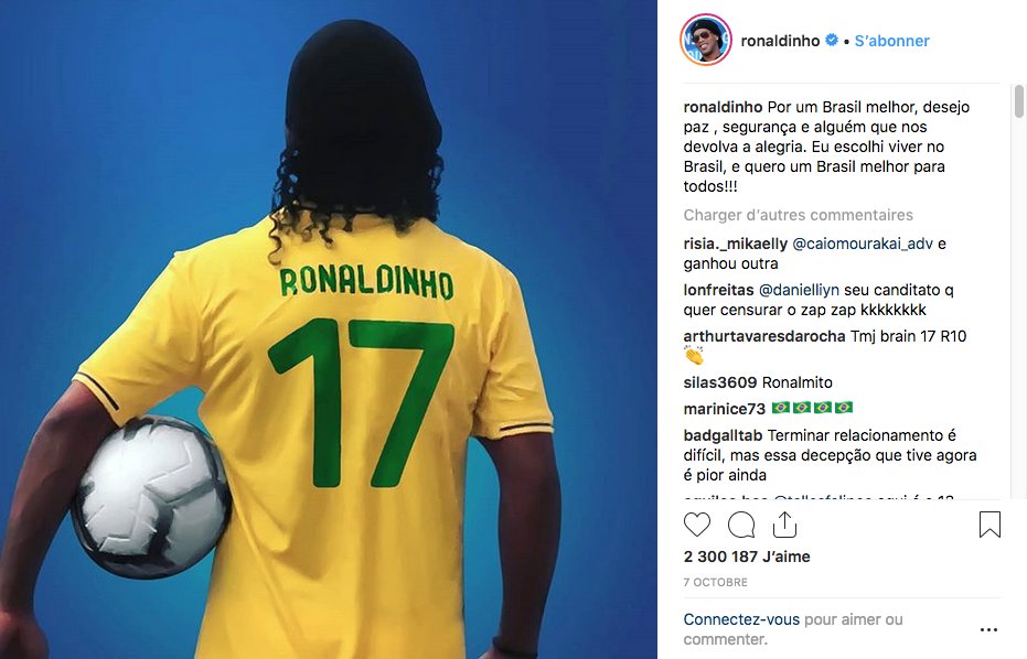 Ronaldinho publie un post Instagram de soutien à Bolsonaro, portant un maillot floqué de son numéro 17, engendrant plus de deux millions de « likes » et plus de 100.000 commentaires. Felipe Melo, du Palmeiras, dédie son but inscrit face à Bahia « à Dieu, à sa famille et au futur président Bolsonaro », qu’il soutient sur les réseaux sociaux. Rivaldo, champion du monde, publie des messages pro-Bolsonaro : « Fier d’être Brésilien ! Quand je vois ces vidéos d’allégresse [de la foule avec Bolsonaro], cela me rappelle la fête quand nous avons gagné la Coupe du monde 2002. » Cafu, capitaine et double champion du Monde, a très tôt annoncé son soutien en vidéo : « Le capitaine du 5 fois champion Brésil votera pour Bolsonaro. »