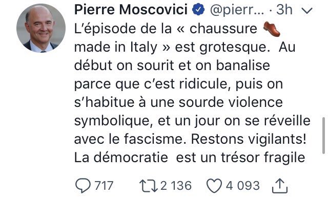 Il y a, évidemment, le sketch dit « de la chaussure », coréalisé avec son acolyte italien, le député de la Ligue Angelo Ciocca, qui s’est essuyé la godasse made in Italy sur les recommandations budgétaires du commissaire européen ; Pierre Moscovici, donc. Lequel, jamais avare d’une bonne repartie – à côté, Jean Roucas, c’est Alain Badiou –, a aussitôt tweeté : « L’épisode de la “chaussure made in Italy” est grotesque. Au début on sourit et on banalise parce que c’est ridicule, puis on s’habitue à une sourde violence symbolique, et un jour on se réveille avec le fascisme. Restons vigilants ! La démocratie est un trésor fragile. » À leur grande époque, les Inconnus n’auraient pas mieux dit.