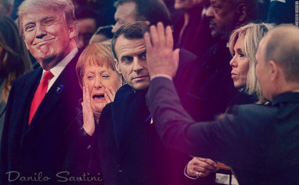 Macron a intégré pourtant 14-18 au pôle noir de l’humanité qui est ordinairement représenté par 39-45. A partir de là il en a tiré les leçons qu’un lauréat au concours général d’instruction civique modèle 36 rectifié 2018 ne pouvait manquer de formuler. La guerre nourrit naturellement un forum de la paix où devaient briller en priorité l’ancien ennemi de 14, i.e. l’Allemagne, représentée par sa chancelière, Angela Merkel, avec qui Macron à Douaumont n’avait pas manqué de se frotter le museau, et l’Organisation des Nations unies, représentée par son secrétaire général, Antonio Gutteres. Ces excellentes personnes nous ont dit que leur devoir et le nôtre était de préserver la paix, et qu’à cette fin le multi-latéralisme était la bonne méthode. Pendant ce temps-là Trump vaquait à ses occupations. On le montra du doigt. Il ne faisait pourtant qu’imiter Bush et Colin Powell qui, dans la guerre d’Irak en 2003, avaient envoyé promener le multi-latéralisme. Ainsi font les Etats-Unis, rois du monde, quand ça les arrange.