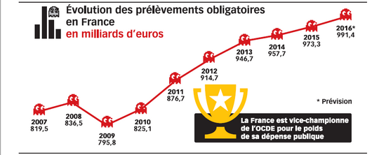 A chaque jour suffit sa taxe. Et si on vous dit que les impôts baissent, demandez-vous alors comment les prélèvements obligatoires sont passés de 819,5 milliards d’euros en 2007 à 914,7 milliards d’euros en 2012 et 973,3 milliards d’euros en 2015, pour sans doute dépasser les 1 000 milliards d’euros en 2017. D’autant qu’il n’est pas certain que, dans le même temps, vos revenus aient eux aussi augmenté de plus de 20% sur la même période…