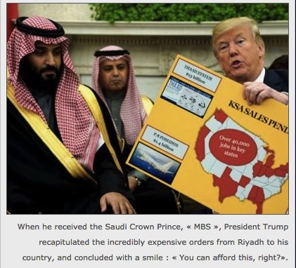 Comme le Sultan Erdogan, MBS devra se faire adouber par la communauté internationale afin de se bâtir une stature d’homme d’Etat et faire passer ainsi l’Arabie saoudite de propriété privée de la famille des Seouds à un état nation à la pointe de la modernité, satisfaisant ainsi à la demande pressante de Trump qui ne veut plus avoir à gérer le coût exorbitant des troupes statués au Moyen orient et en Europe.