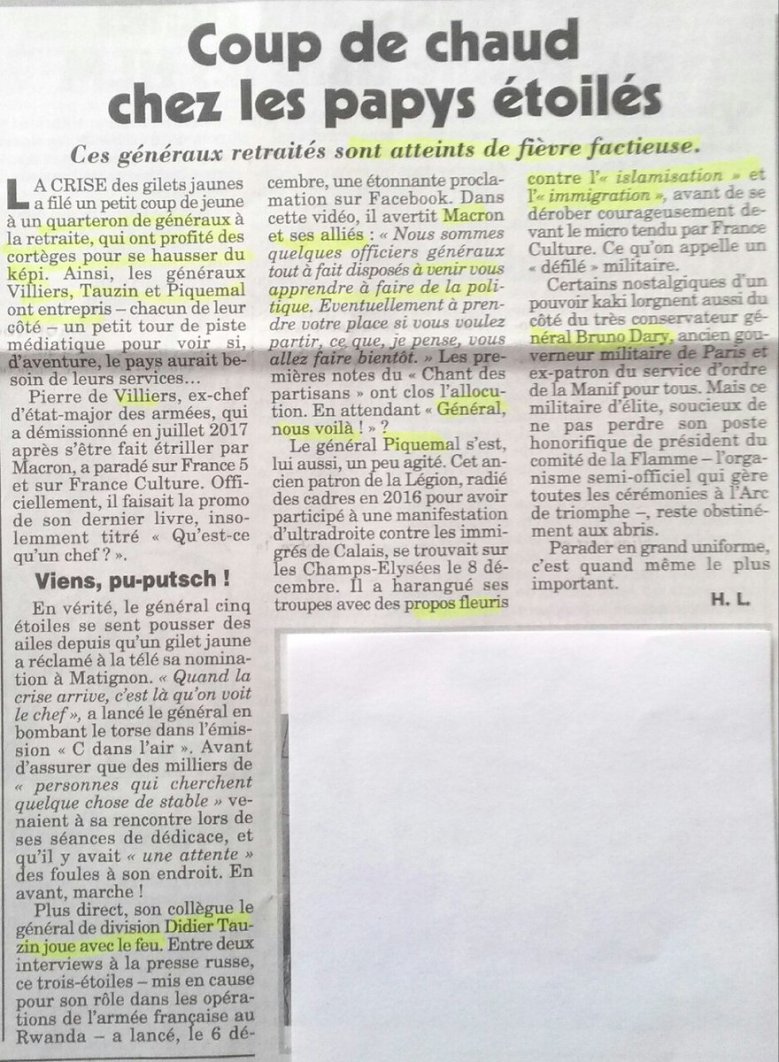 Lorsque des Généraux (2S) prennent la parole pour critiquer leur autorité, c’est plutôt mauvais signe. Maintenant il y a près de 5000 (Cinq milles) Généraux en France. 600 environ sont en activité, les autres ce que l’on pourrait appeler « en retraite » . Une dizaine de Généraux sans influence sur des troupes (au contraire de l’Algérie), c’est du cinéma. Lorsque mille Généraux signeront un manifeste explicite, ce sera plus sérieux. Strasbourg ? Pourquoi tous les cinglés jouant avec des armes à feu sont-ils des terroristes islamistes ???? Tout le monde prétexte, manipule, les médias ne connaissent pas les justes mots. Et il est à craindre que le jeu de la manipulation ne serve que ceux qui sont aux commandes de l’argent.