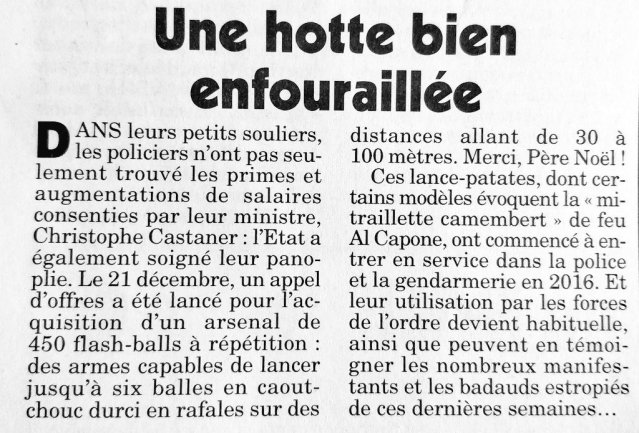 En plus des augmentations de salaires et des primes, la liste des policiers pr le Père Noël s’allonge. Un appel d’offres a été lancé pour l’acquisition de 450 flashball à répétition. Ces armes peuvent tirer jusqu’à 6 balles en caoutchouc en rafales. (Canard Enchaîné)