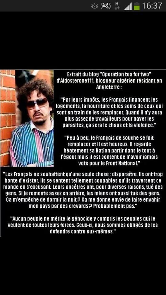 Je partage cette analyse au vitriol intellectuel, même en tant que fils d’immigré.Un regard un peu trop superficiel pourrait juger ces propos racistes en comparant les migrants à des animaux pondeurs qu’on observe avec des yeux catastrophés..Il pourrait juger caricatural, diffamatoire, le fait de mettre dans le même sac immonde de la criminalité l’ensemble des migrants. Mais il faut aller au delà de ce regard superficiel et y déceler la volonté de dénoncer le naufrage en cours d’une Nation ,la dissolution d’une l’ethnie blanche autochtone dans l’universalité d’un métissage sans réelle Patrie.La volonté de dénoncer le naufrage de la dignité humaine par la promotion systématique de la dépravation sexuelle sans limites.