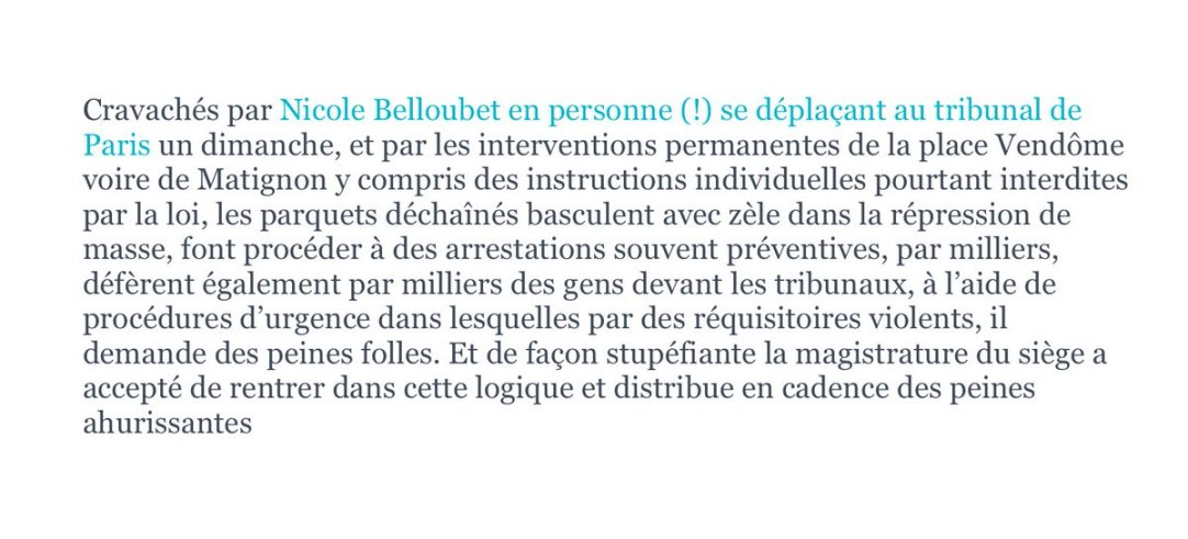 Des incriminations délirantes, des procédures expéditives sans respect des formes, des réquisitions incroyablement féroces et des peines tout aussi invraisemblables. Je n’ai jamais vu une chose pareille dans ma pourtant longue carrière, et même en 1968 (je n’avais pas encore endossé la robe). Cette répression est sans précédent, et c’est une catastrophe de voir l’institution judiciaire, se vivant comme un outil de maintien de l’ordre, revenir à ses vieux démons.