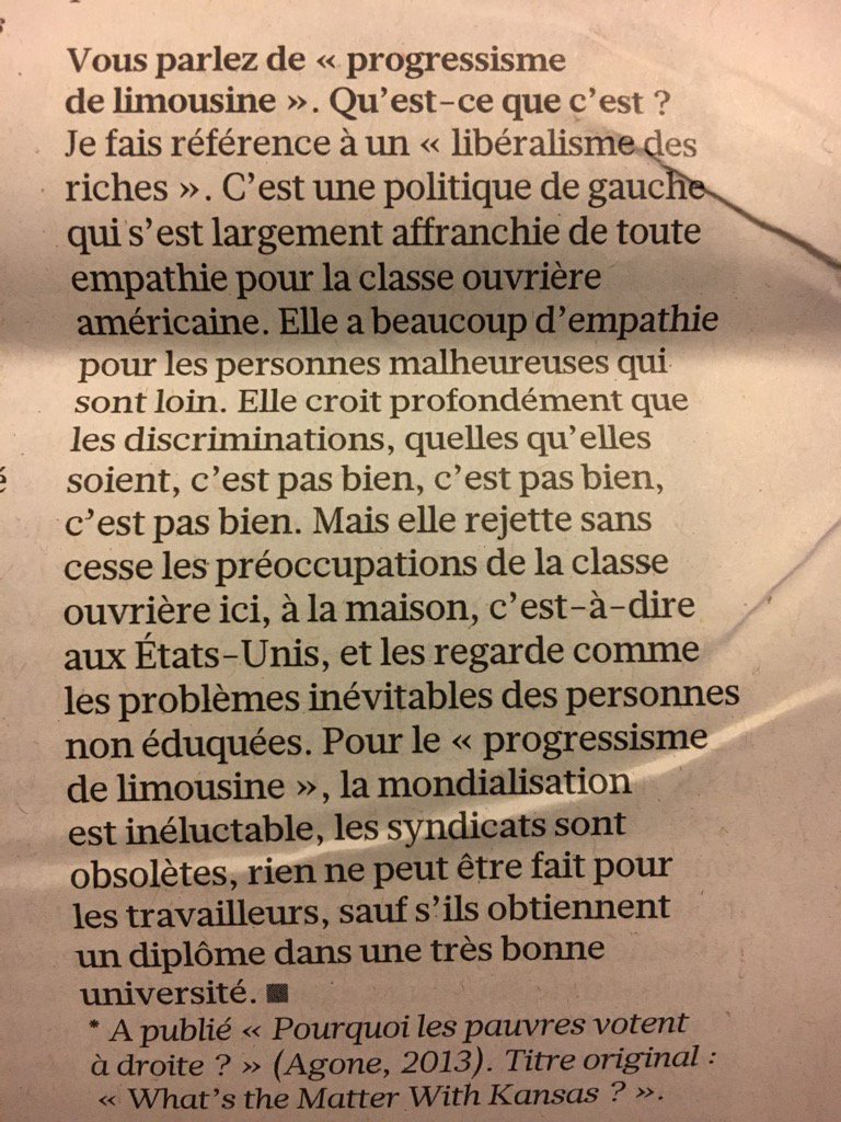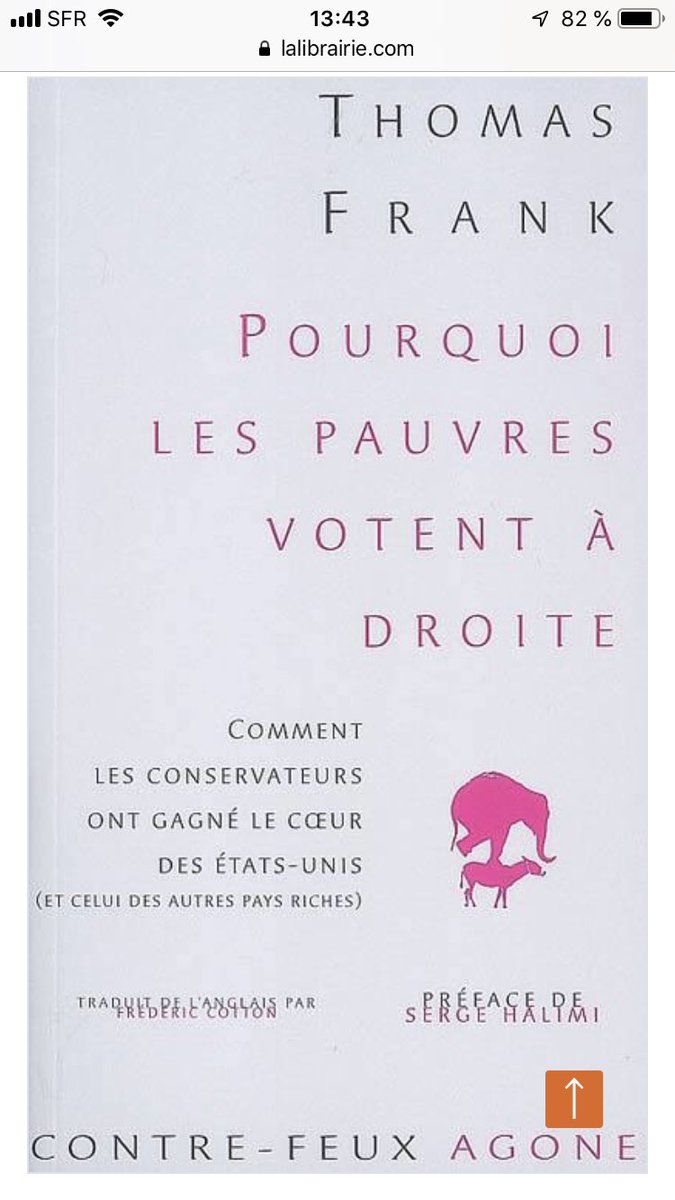 Tout ce que dit Thomas Frank est frappé au coin du bon sens : une seule observation, à savoir que la trahison du pauvre – et la célébration du fric – par la gauche entame son troisième siècle. Tout est déjà observé à la fin du dix-neuvième siècle par Roberto Michels, Georges Sorel et bien sûr par un Engels aigri. Serge Halimi l’avait recensé dans son essai Sisyphe est fatigué. Depuis la gauche mondialiste évente son agenda bouffon (climat, migrants, théorie du genre, etc.) en instaurant la dictature messianique de son fric moraliste.