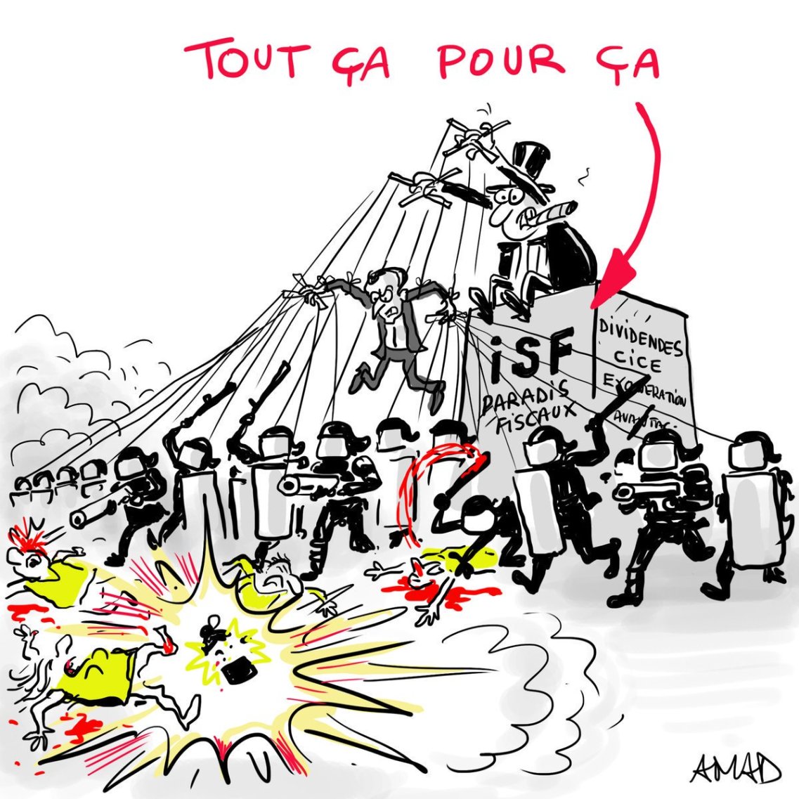 La part du renard est celle de la ruse, elle a bien sûr été utilisée. Dans l’allocution du 10 décembre dernier, le renard en chef annonce qu’une grosse enveloppe fabriquée vite fait bien fait va permettre de distribuer un peu d’argent. Il calme la poignée qui renonce au combat pour sa dignité avec quelques euros. L’aumône a toujours été le contraire de la justice. Ruse du riche qui achète le renoncement du pauvre à être digne avec l’argent qu’il lui prend, tout en épargnant la richesse de l’indigne qui possède vraiment. C’est la vieille histoire du plat de lentilles avec lequel on s’offre ce qui, sinon, aurait pu devenir un empire.