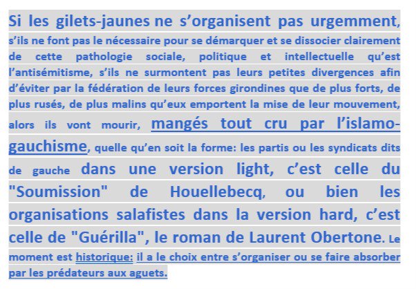 Si les gilets-jaunes ne s’organisent pas urgemment, s’ils ne font pas le nécessaire pour se démarquer et se dissocier clairement de cette pathologie sociale, politique et intellectuelle qu’est l’antisémitisme, s’ils ne surmontent pas leurs petites divergences afin d’éviter par la fédération de leurs forces girondines que de plus forts, de plus rusés, de plus malins qu’eux emportent la mise de leur mouvement, alors ils vont mourir, mangés tout cru par l’islamo-gauchisme, quelle qu’en soit la forme: les partis ou les syndicats dits de gauche dans une version light, c’est celle du « Soumission » de Houellebecq, ou bien les organisations salafistes dans la version hard, c’est celle de « Guérilla », le roman de Laurent Obertone. Le moment est historique: il a le choix entre s’organiser ou se faire absorber par les prédateurs aux aguets.