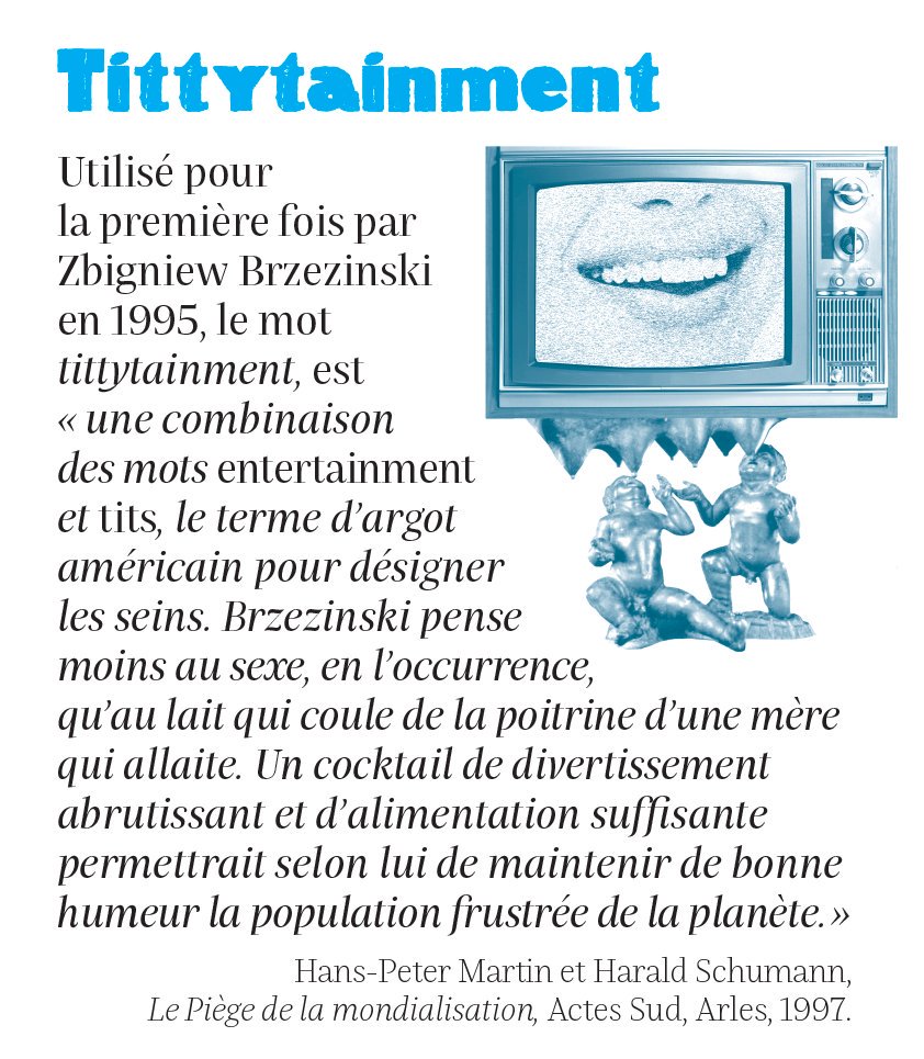 L’expression « tittytainment », proposée par ce vieux grognard de Zbigniew Brzezinski, fait en revanche carrière. Ce natif de Pologne a été quatre années durant conseiller pour la Sécurité nationale auprès du président américain Jimmy Carter. Depuis, il se consacre aux questions géostratégiques. Tittytainment, selon Brzezinski, est une combinaison des mots entertainment et tits, le terme d’argot américain pour désigner les seins. Brzezinski pense moins au sexe, en l’occurrence, qu’au lait qui coule de la poitrine d’une mère qui allaite. Un cocktail de divertissement abrutissant et d’alimentation suffisante permettrait selon lui de maintenir de bonne humeur la population frustrée de la planète. »