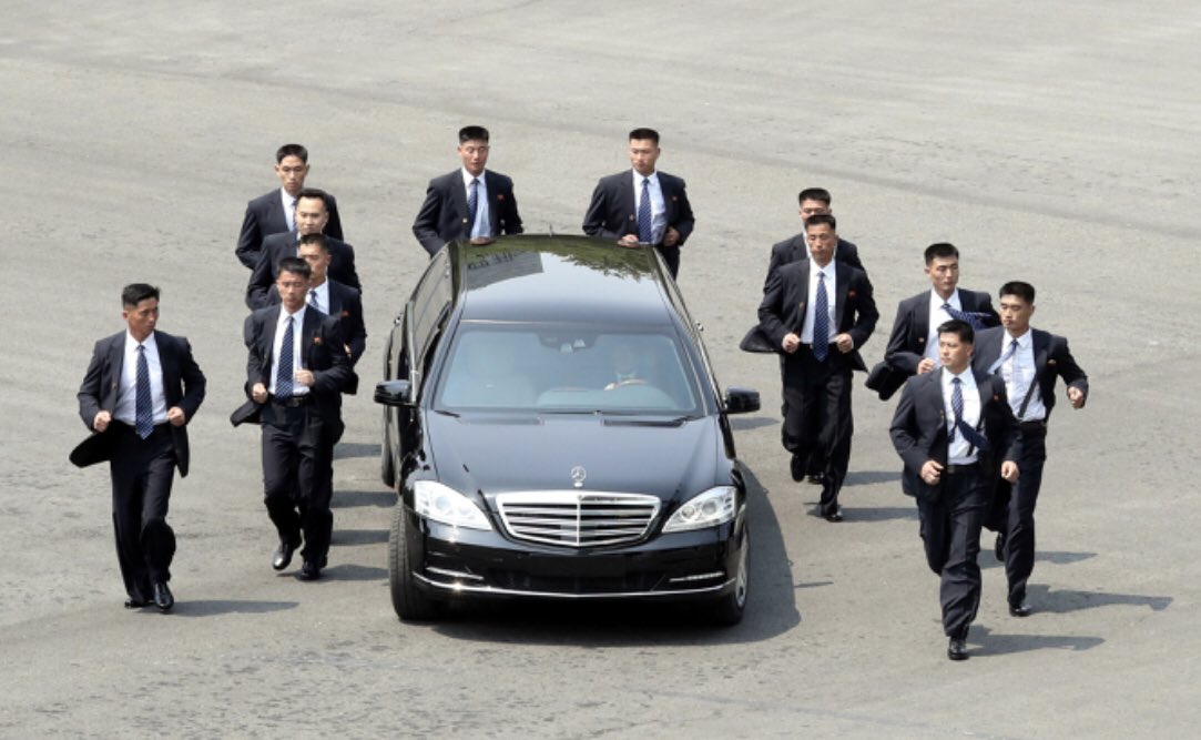 Pour un Président Trump désormais plus en sécurité à l’étranger que dans son propre pays les gardes du corps sont une source de fascination et d’inspiration « benallesque », tout comme le leader nord-coréen Kim Jong-un. Cette semaine encore, des images combinant les deux ont fait surface. La question est de savoir quelle peut être l’utilité de 12 gardes du corps à proximité immédiate d’une Mercedes blindée (lire : pare-balles) ?