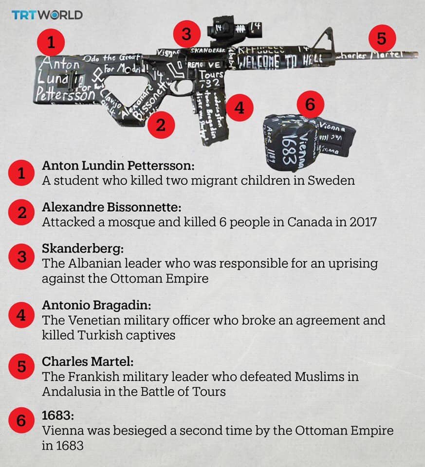Le tueur néo-zélandais a inscrit ses sources d’inspiration sur ses armes : des assassins d’extrême droite, un symbole nazi slave, des personnages historiques slaves et d’Europe centrale, et les viols de jeunes filles blanches par des musulmans.