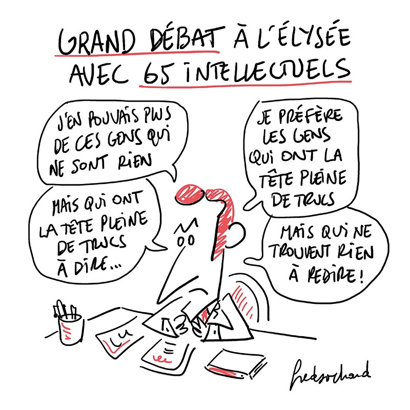 Dominique Méda parle d’un « non débat avec les intellectuels ». Faut-il qu’elle expérimente elle-même l’enfumage pour constater enfin qu’elle a fait les frais de la même méthode que les élus et les autres Français convoqués par les préfectures -ce qui n’est pas étonnant! N’avait-elle pas vu que cette logorrhée narcissique du Président était sa signature? De deux choses l’une: soit Dominique Méda ne s’est pas tenue au courant de l’actualité depuis le début des gilets-jaunes, donc depuis quatre mois, soit elle n’y a rien compris. Dans les deux cas, pour une sociologue estampillée par l’institution, c’était une erreur de n’avoir pas regardé au moins l’un de ces multiples faux débats; soit, pour une philosophe estampillée par l’institution, c’était une erreur de n’y avoir pas vu la stratégie d’enfumage. A quoi servent hypokhâgne et khâgne à Henri-IV? Normale sup et l’agrégation? Le doctorat et la chaire universitaire?  Les médailles distribuées par la république française ou la monarchie belge? Cette dame fit partie de la matière grise collective de Benoit Hamon aux dernières élections présidentielles -on comprend mieux le score…