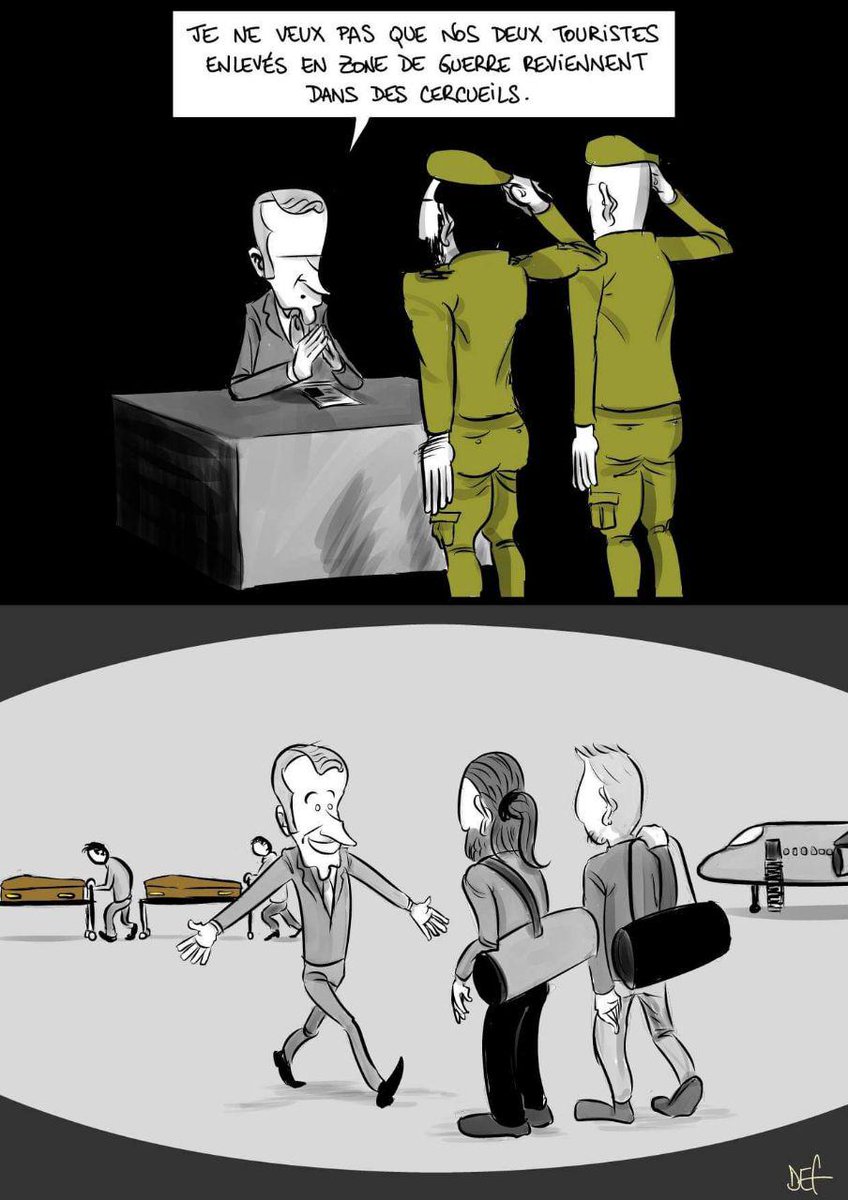 Touristes parfaitement sains et saufs batifolant en zone rouge djihadiste responsables de la mort de deux de nos meilleurs soldats : accueil officiel par Macron à Villacoublay.
