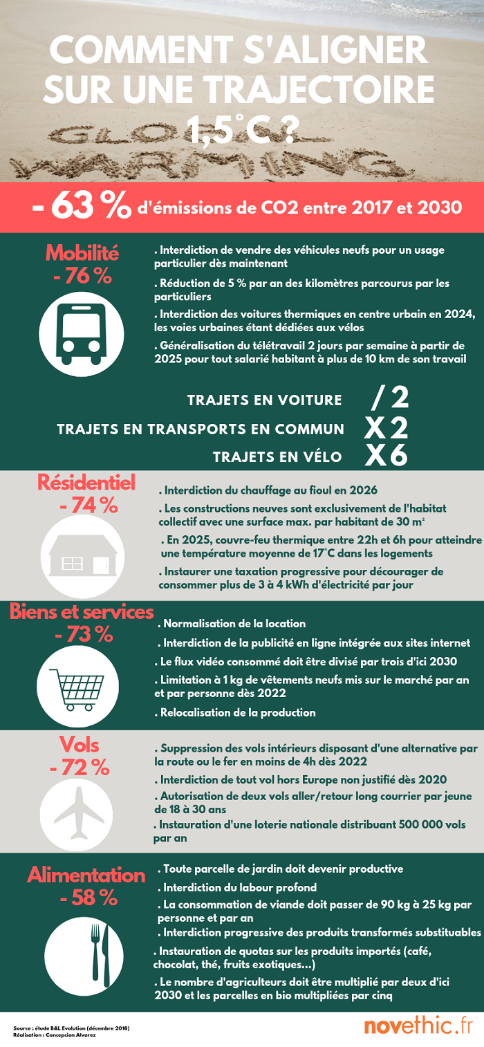 Dans un document datant de décembre 2018, Novethic propose, entre autres, l’interdiction de vendre des véhicules pour un usage particulier dès maintenant. Les habitats neufs devront forcément être collectifs et avec une surface maximum par habitant de 30m² en 2025. Il faudra imposer un couvre-feu thermique entre 22h et 6h pour atteindre une température moyenne de 17°C dans les logements. Diviser le flux vidéo sur internet par trois d’ici 2030. Limiter à 1kg de vêtements neufs par an et par personne dès 2022, l’instauration de quotas sur les produits importés tel que le café, le chocolat ou le thé. Doubler le nombre d’agriculteurs d’ici 2030 (qui devront probablement travailler dans les kolkhozes bio de l’état ?) ou encore l’interdiction de tout vol hors Europe « non justifié » dès 2020.