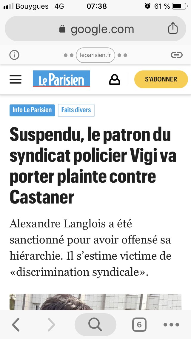Alexandre Langlois, secrétaire général du syndicat de police VIGI, qui a été remarquable pendant la crise des Gilets Jaunes, et probablement le seul à critiquer l’action de l’exécutif dans le traitement de cette crise, qui ne mâche pas ses mots, bref, qui fait un vrai travail de syndicaliste et non pas un partage complaisant du gâteau avec le pouvoir contrairement à ce que sont désormais devenus la plupart des autres syndicats notamment de policiers, -lesquels se sont notamment distingués par leur veulerie et leur lâcheté à l’encontre des gilets jaunes qu’ils n’ont jamais soutenus (trop effrayés sans doute à l’idée de perdre leurs prébendes et avantages sous les dorures de la République)-, Alexandre Langlois donc est suspendu de ses fonctions dans la police.