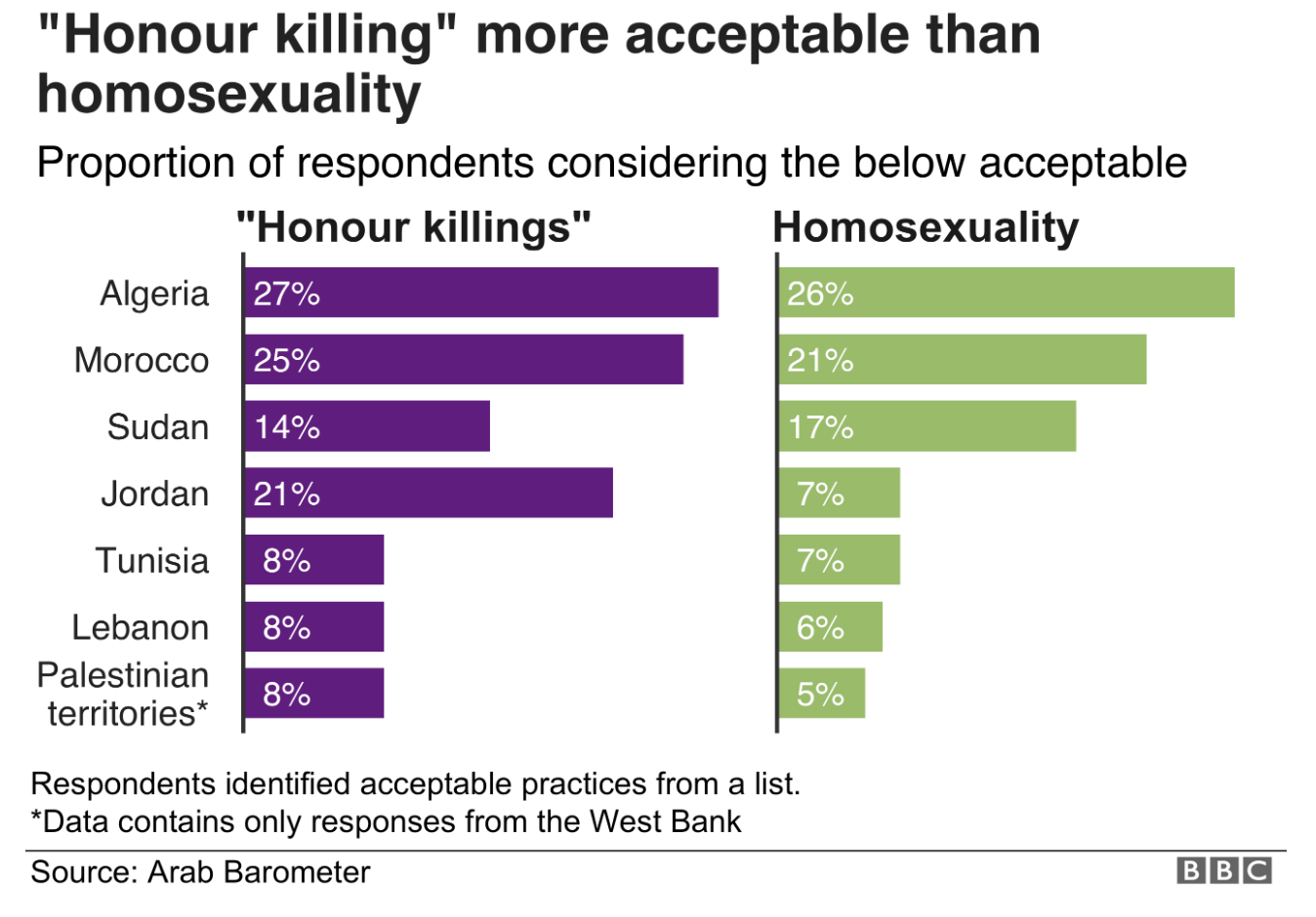 Dans plusieurs pays musulmans, les crimes d’honneur sont plus acceptables que l’homosexualité. Un crime d’honneur est un meurtre au cours duquel un membre de la famille, souvent une femme, est tué parce qu’il aurait porté atteinte à l’honneur de la famille.