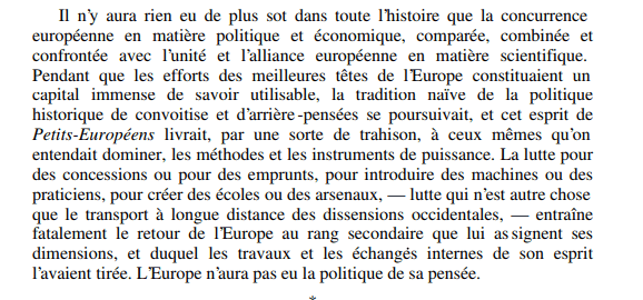 Les effets devenant si rapidement incalculables par leurs causes, et même antagonistes de leurs causes, peut‑être trouvera‑t‑on puéril, dangereux, insensé désormais, de chercher l’événement, d’essayer de le produire, ou d’empêcher sa production ; peut‑être l’esprit politique cessera‑t‑il de penser par événements, habitude essentiellement due à l’histoire et entretenue par elle.