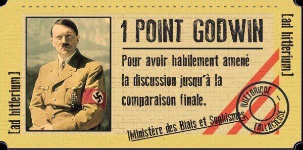 Pour ma part quand quelqu’un me prend la tête avec les végans ou végétariens je leur rappelle que Adolphe été végétarien, ça clôture le débat … de même que quand je discute avec une personne sur n’importe quel sujet, j’ai pris l’habitude de trouver un parallèle avec un quelconque totalitarisme, communisme, nazisme, fascisme … je fini toujours par cloué le bec à mon contradicteur, je m’amuse, même si je suis d’accord sur le sujet avec la personne.