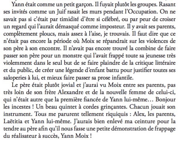 Et si la question ici se pose avec autant d’acuité, c’est précisément parce qu’il ne s’agit pas de littérature, mais de psychanalyse familiale de supermarché sur fond d’autopromotion commerciale victimaire et véhémente, dont Yann Moix, parmi d’autres auteurs du même genre, s’est fait le principal bonimenteur de foire médiatique. »