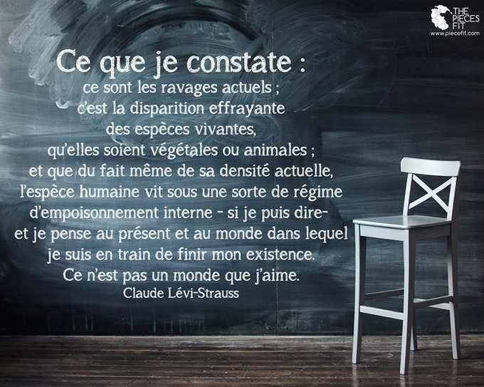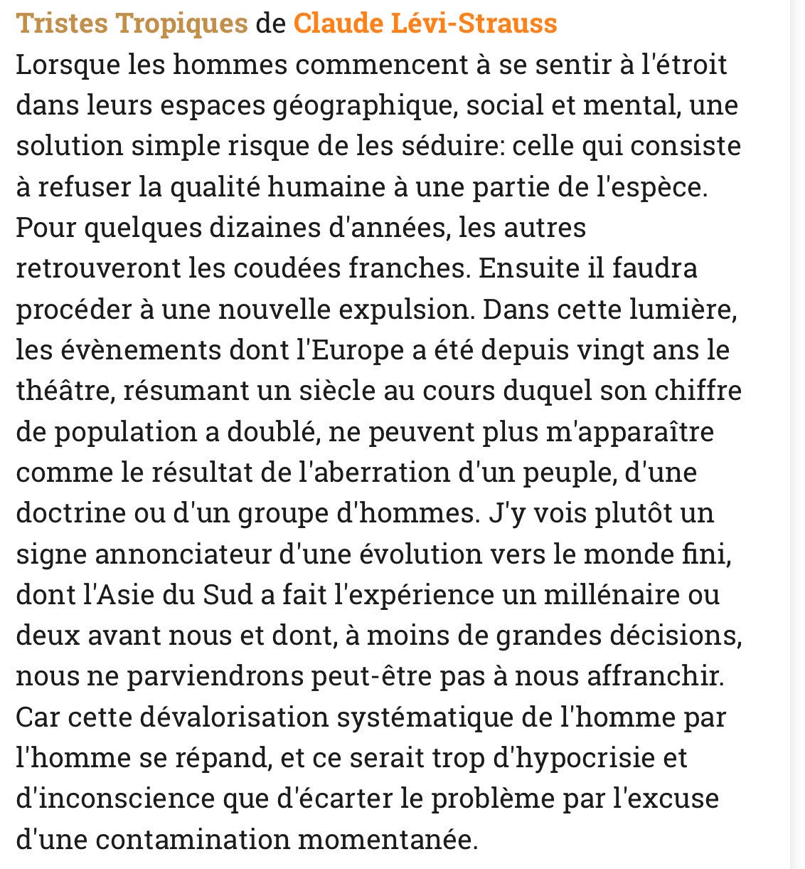 « Aujourd’hui où des îles polynésiennes noyées de béton sont transformées en porte-avions pesamment ancrés au fond des mers du Sud, où l’Asie tout entière prend le visage d’une zone maladive, où les bidonvilles rongent l’Afrique, où l’aviation commerciale et militaire flétrit la candeur de la forêt américaine ou mélanésienne avant même d’en pouvoir détruire la virginité, comment la prétendue évasion du voyage pourrait-elle réussir autre chose que nous confronter aux formes les plus malheureuses de notre existence historique ? »