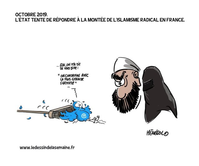 La gauche crie à l’islamophobie: un radicalisé est peut-être un terroriste en puissance mais dire qu’il l’est en puissance est un procès d’intention, il faut qu’il le soit en acte. Et encore car, quand le terroriste en puissance est devenu terroriste en acte et qu’il a laissé quatre cadavres dans leur sang sur le sol, on finit tout de même par expliquer que la tuerie n’a rien à voir avec l’islam, qu’on pratique l’amalgame, etc. De bonne âmes frottées de sophistique vont même jusqu’à affirmer que le policier ayant arrêté le terroriste dans sa course aurait pu tirer dans les jambes pour épargner cette vie précieuse ou que, affligé de surdité, le tueur qui brandissait un couteau n’a pu entendre les diverses sommations qui lui ont été faites et qu’il y a là quelque chose comme une illégalité, un vice de forme ou de procédure qui pourrait bien se retourner contre… le policier qui arrête le massacre! D’ici à ce qu’un avocat propose bientôt dans un procès d’indemniser la famille du renard qui a répandu la terreur, il n’y a qu’un pas…
