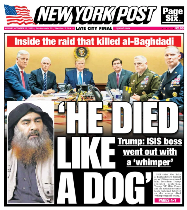Le titre hilarant et surréaliste du Washington Post: « Abou Bakr Al-Baghdadi: la figure intellectuelle religieuse austère à la tête de l’Etat Islamique, meurt à 48 ans ». Intellectuel ? Religieux ? Austère ? Le Washington Post devrait être poursuivi en justice pour débiter de telles énormités.