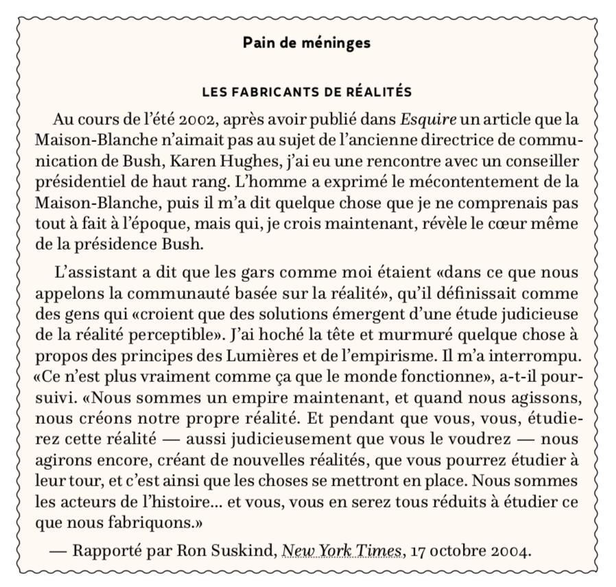 La manipulation grossière passera. Plus c’est grossier et plus c’est vraisemblable et l’on comprend maintenant pourquoi le système dominant cherche tant à abrutir les peuples et à niveler les niveaux d’éducation. Dans un monde où la télé-réalité et les commentaires abrutissants des réseaux sociaux sont devenus la norme, une autre élimination d’Al-Baghdadi passera comme une lettre à la poste.