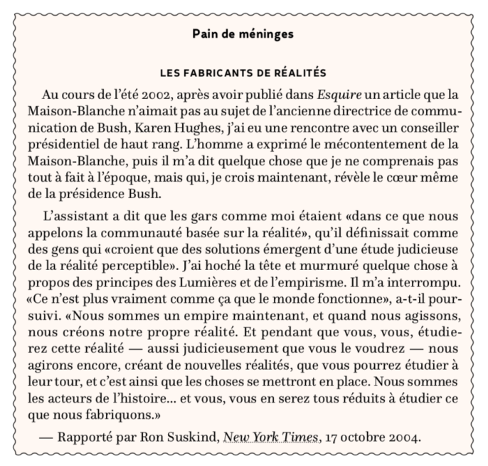 Nous sommes nourris d’une série de fictions soigneusement conçues qui ne ressemblent en rien à la réalité.
