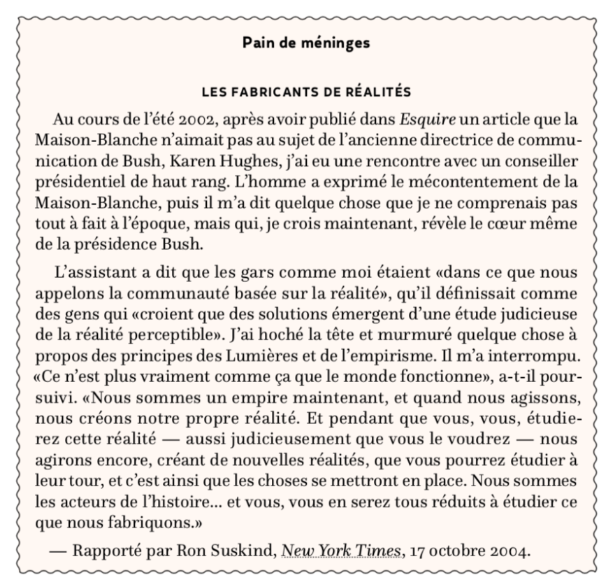 De la même manière, l’empire américain se comporte comme un consommateur colossal; obsédé par la divinisation de lui-même, qui n’est plus lié aux réalités substantielles du monde. Le projet américain consiste à libérer le «soi impérial souverain» (Weigel) de la pluralité afin de devenir de plus en plus identique à soi-même. Pour l’Empire américain, la pluralité, caractéristique des réalités intrinsèques , est un défaut d’être. La pluralité doit être abolie car l’empire américain ne cherche rien au-delà de lui-même. Un des assistants de George Bush, qui s’est moqué de ce qu’il appelle une „communauté basée sur la réalité”, a déclaré: „Nous avons un empire maintenant, et lorsque nous agissons, nous créons notre propre réalité”.