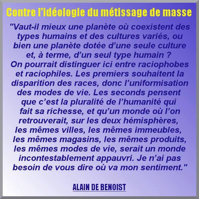 Par contre j’aime beaucoup la citation de Benoist : raciophile / raciophobe, c’est tout à fait ça. Et pour le coup ce n’est pas faire de la novlangue, les gauchistes ont une peur irraisonnée des races.