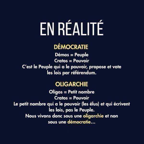 L’oligarchie résulte d’une démocratie dévoyée issue d’un non-contrôle systémique. Une fois élu le quidam censé représenter ses électeurs s’assoit sur ses promesses électorales et n’en fait qu’à sa guise, pardon il suit aveuglément les con-signes de son parti pour profiter au mieux de sa nouvelle vie de cocagne et avoir la meilleure chance d’être réélu, il apprend ainsi l’hypocrisie démocratique.