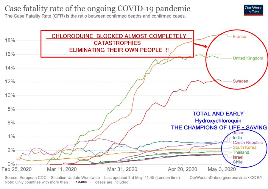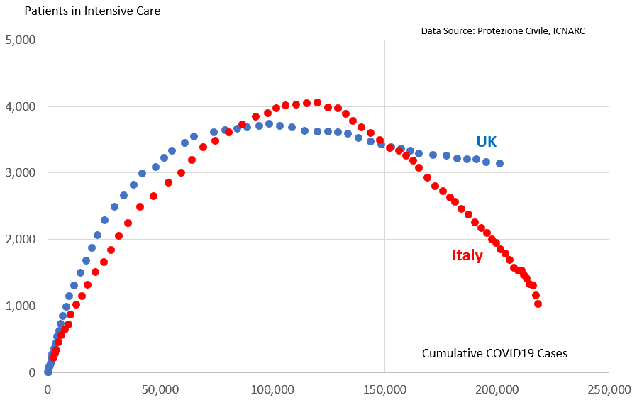 L’utilisation précoce de la #Hydroxychloroquine a conduit à une réduction spectaculaire des cas et des décès en réanimation en Italie et à des taux de récupération beaucoup plus rapides. Alors qu’au Royaume-Uni, où le traitement HCQ pour Covid-19 a été interdit par le gouvernement, les cas et les décès en soins intensifs sont toujours à un taux élevé.