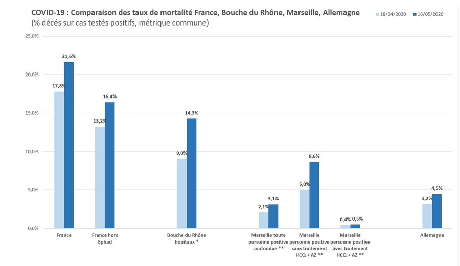 Comparaison des taux de mortalité Covid-19 en France. A Marseille où le traitement HCQ & AZT est utilisé par le professeur Didier Raoult, le taux de mortalité des cas référés pour un traitement hospitalier est de 0,5%. Alors qu’en France non HCQ le taux de mortalité est de 15-20%. Macron a interdit l’utilisation non hospitalière du HCQ.