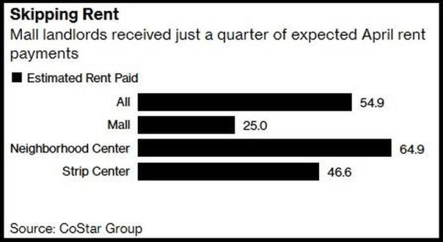 et selon Bloomberg, ce catalyseur est arrivé au cours de la semaine dernière, alors que les propriétaires de commerces de détail ont envoyé des milliers d’avis de défaut de paiement aux locataires, qui ces derniers, ont connu un effondrement de leur clientèle, des ventes et des flux de trésorerie dus à la pandémie de Covid-19, et sont tout simplement dans l’incapacité de rembourser leurs dettes.Selon Bloomberg, les restaurants, les grands magasins, les marchands de vêtements et les chaînes spécialisées ont reçu les avis des propriétaires – dont ces derniers sont restés jusqu’à trois mois sans recevoir de loyer. « Les lettres de défaut des propriétaires se multiplient de plus enplus », a déclaré Andy Graiser, coprésident de la société immobilière commerciale A&G Real Estate Partners. « Cela a créé une véritable angoisse sur le marché » La pression des avis de défaut de paiement et des actions qui ont suivi comme la fermeture de magasins ou la réalisation de baux a été cité dans les faillites de Modell’s Sporting Goods and Stage Stores Inc. De nombreuses chaînes ont cessé de payer leur loyer après que la pandémie ait fait fermer la plupart des magasins américains, qui ont essayer de tenir le plus longtemps possible grâce à un peu de trésorerie avant que les propriétaires ne leur demandent le paiement du loyer. Les enjeux sont énormes et les propriétaires souffrent également. Un loyer estimé à 7,4 milliards de dollars pour le mois d’avril n’a pas été payé, soit environ 45% de ce qui est dû, selon une analyse récente de CoStar Group, qui a également constaté que seulement un quart des paiements de loyers attendus avaient été reçus par les propriétaires.