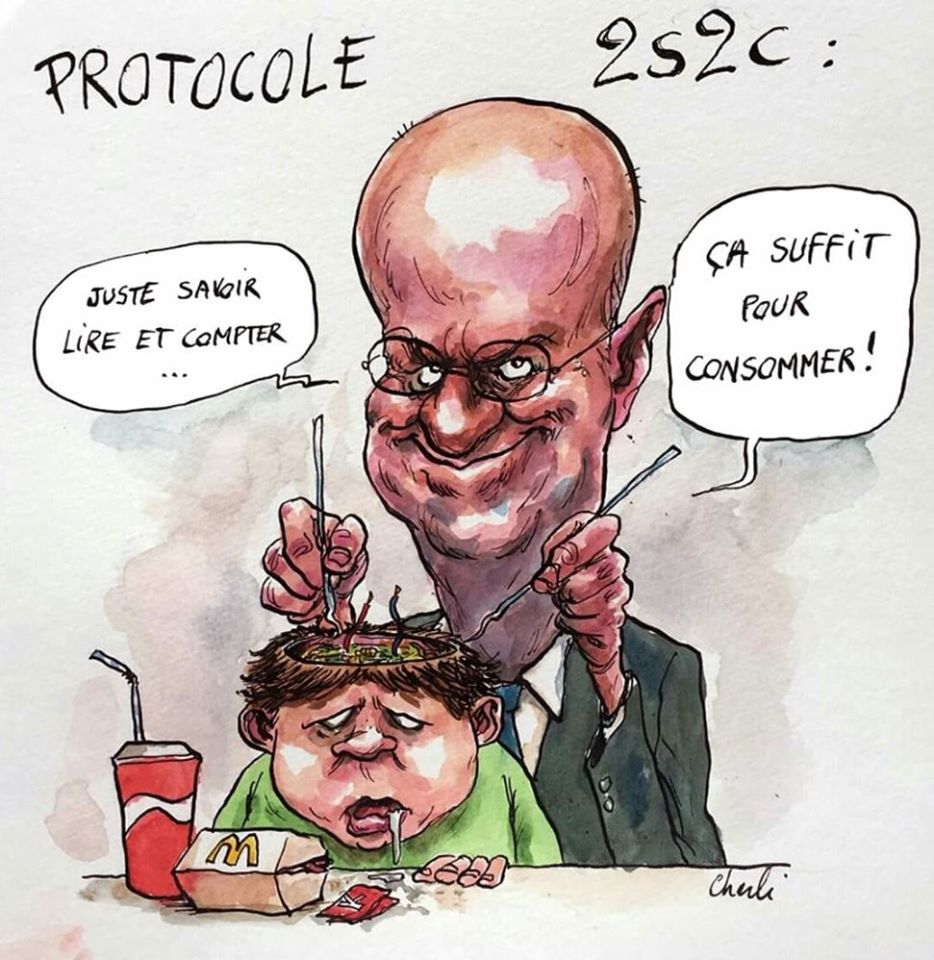 Et ce nouveau monde propose donc deux formes d’enseignement. Un enseignement réel, physique, avec un contact entre élèves et enseignants, avec des livres, des cahiers et des bibliothèques, un enseignement cher – pour l’élite. Et un enseignement low cost, avec zoom et wikipédia, « débarrassé des contraintes de temps et de lieu » où les enfants seront obligés de passer des heures assis devant un écran (ce qui est très mauvais pour leur santé) ou bien où les cours, pour tenir compte justement de leur santé seront réduits à 10-20 minutes, pour la forme. Un enseignement peu cher, rentable. Pour la plèbe. Qui ensuite pourra aller vendre dans des magasins des smartphones et des tablettes. Puisque comme précisé dans le rapport de l’OCDE, elle saura lire, compter et manier les technologies, elle pourra établir une facture et même encaisser l’argent, sans trop d’erreurs.