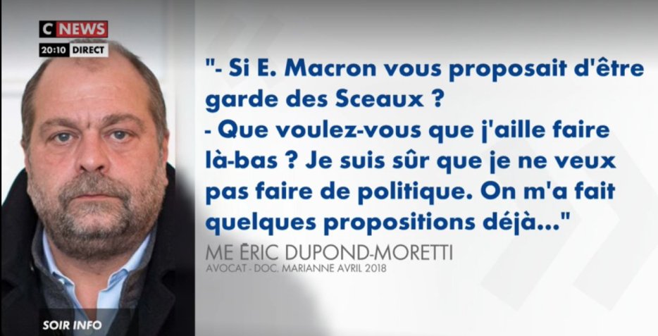 Oui, bien sûr. Deux nominations fracassantes qui apportent le frisson de la nouveauté et de l’étonnement : M. Dupont-Moretti garde des sceaux, et Mme Bachelot à la culture. Il faut y voir les deux annonces sensationnelles, emblématiques, de ce gouvernement qui masquent la continuité […] Dans les deux cas, il n’y a pas de véritable logique de fond. Deux personnalités médiatiques et non politiques sont promues au plus haut niveau. Nous sommes dans la politique spectacle, la recherche de l’événement, la société du buzz, qui se substitue à l’action publique. Telle est la politique de l’avenir : les ministres ne se recruteront plus au parlement, parmi les élus de la Nation, mais parmi de grandes figures médiatiques.