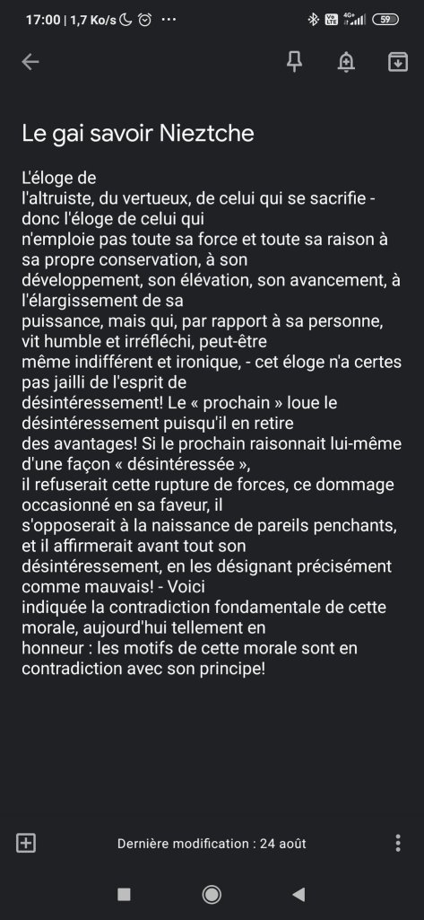 Au con­traire, le besoin de foi, de quelque chose d’indépendant du oui et du non […] est un besoin de la faiblesse. L’homme de foi, le « croyant » de toutes espèces, est nécessairement un homme dépendant, — quelqu’un qui ne se considère pas comme but, qui ne peut en général pas faire partir de lui des buts. Le « croyant » ne s’appartient pas, il ne peut être que moyen, il doit être consommé, il a besoin de quel­qu’un qui le consomme. […] Toute espèce de foi en une chose est elle-même une sorte de sacrifice, d’éloignement de soi.