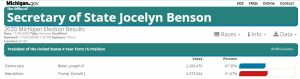 Pourtant, la situation au Michigan est très étonnante. Car si CNN, cour suprême médiatique, a donné le ton en attribuant à la victoire à Biden, en regardant les résultats officiels sur le site de la commission électorale (ici), l’on observe la victoire de Trump :
