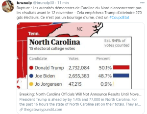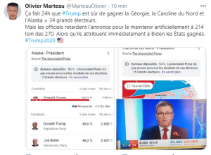 Le niveau de manipulation est sans précédent. Ainsi, certains Etats, a priori remportés par Trump, retardent l’annonce des résultats et bloquent ainsi les chiffres temporaires donnant une avance à Biden.