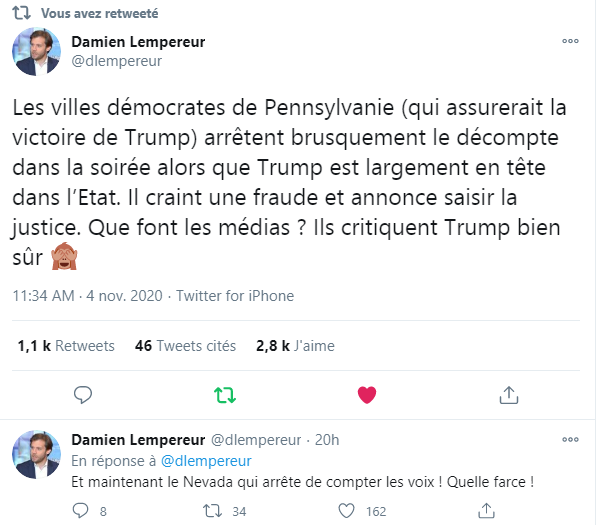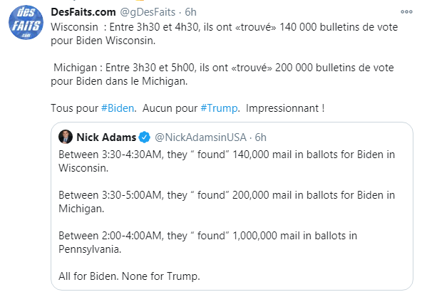 Le niveau de manipulation est sans précédent. Ainsi, certains Etats, a priori remportés par Trump, retardent l’annonce des résultats et bloquent ainsi les chiffres temporaires donnant une avance à Biden.