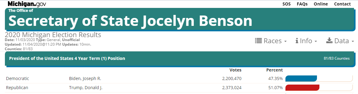 Pourtant, la situation au Michigan est très étonnante. Car si CNN, cour suprême médiatique, a donné le ton en attribuant à la victoire à Biden, en regardant les résultats officiels sur le site de la commission électorale (ici), l’on observe la victoire de Trump :