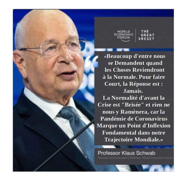 Malgré toutes ces forfaitures, ils sont bel bien au bout du rouleau et du coup, comme tous les mauvais gérants, ils pensent à faire plus de ce qui a déjà échoué et donc à mettre le pied sur l’accélérateur et nous le savons par l’intermédiaire d’un Suisse, Monsieur Schwab, l’organisateur du forum de Davos.