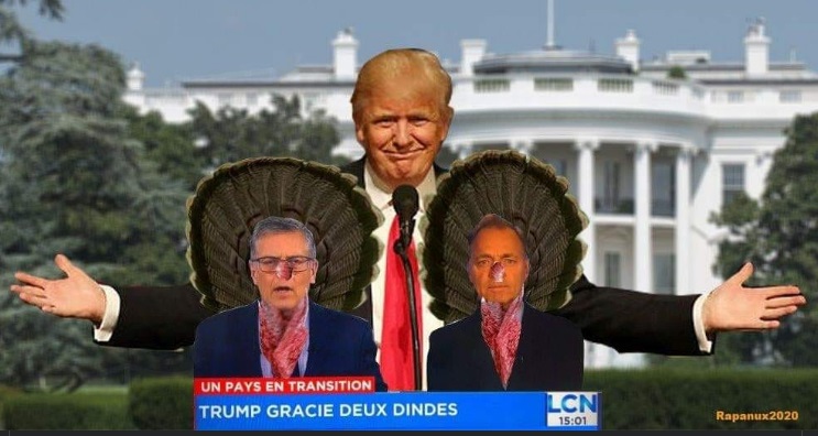 En attendant, passez un agréable Thanksgiving seul à la maison, si vous suivez consciencieusement les ordres des gouverneurs Cuomo, Pritzker, Whitmer, Murphy et Newsom. Nous oserons être sept à table ici, et nous n’aurons donc pas à manger une réincarnation de dinde pendant trois semaines. En prime de vacances, je vous laisse avec une petite note burlesque soumise par un lecteur souhaitant rester anonyme pour votre amusement, comme suit….