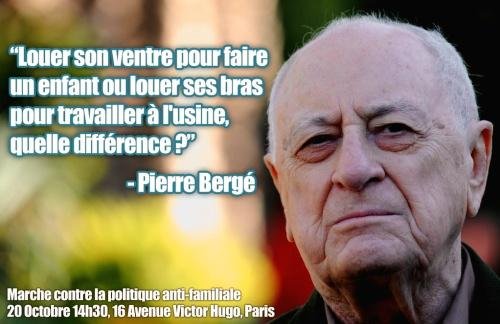 N’est-ce pas le grand bailleur de fonds des socialistes bobos, Pierre Bergé qui a osé faire la comparaison entre louer son ventre et louer ses bras? C’est lui qui trace délibérément le lien entre la perversité et le travail. Ce n’est pas moi! Louer son ventre, louer son cul, salir, dominer, tout cela trace un fil conducteur qui va légitimer l’exploitation la plus sordide et qui explique le parcours infame des socialistes dans le monde.