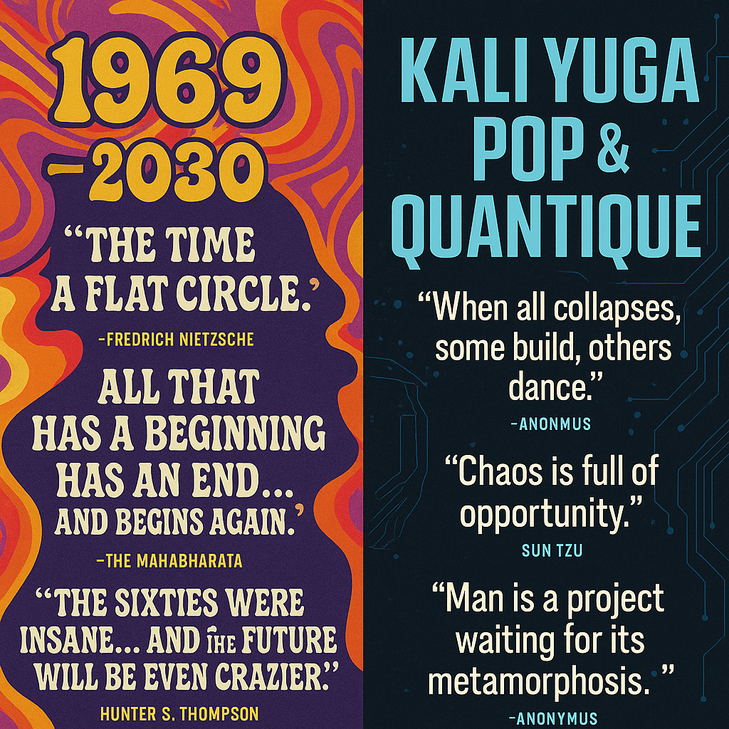 Voici une playlist sonore pour accompagner 1969–2030 : Kali Yuga Pop & Quantique, en mêlant l’énergie psychédélique de 1969 et les vibrations cyberpunk/futuristes de 2030.